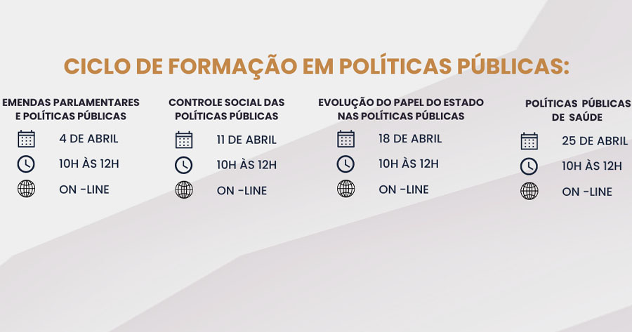 No dia 25 de abril, das 10h às 12h, o “Ciclo de Formação em Políticas Públicas” dará destaque para as “Políticas Públicas de Saúde”. A iniciativa tem por objetivo apresentar um panorama da situação atual e o modo de organização das políticas públicas de saúde no Brasil. A formação será ministrada pelo médico e instrutor da EGC, José Carlos Riechelmann. É dirigido a agentes públicos, conselheiros participativos e membros da sociedade civil.