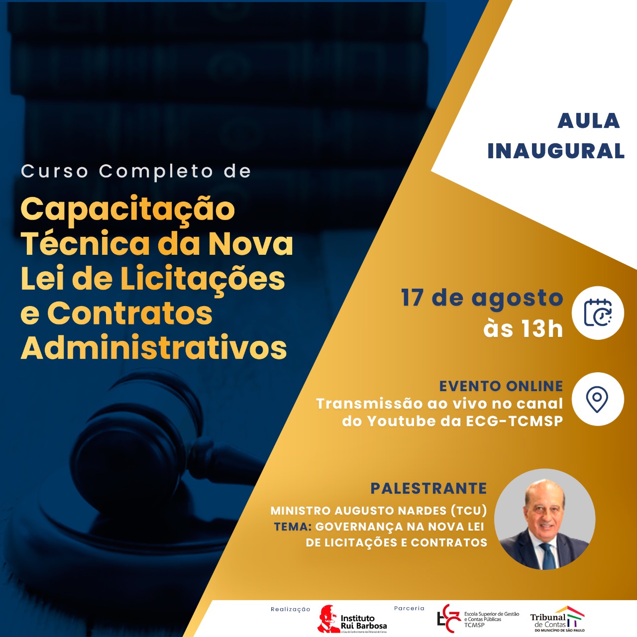 Na próxima quarta-feira (17), às 13h, a Escola Superior de Gestão e Contas Públicas do TCMSP (EGC-TCMSP) transmite, ao vivo, a aula inaugural e lançamento do curso “Capacitação Técnica da Nova Lei de Licitações e Contratos Administrativos”.