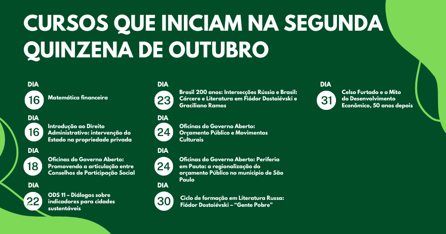 Nesta segunda quinzena de outubro, a Escola Superior de Gestão e Contas Públicas (EGC) do Tribunal de Contas do Município de São Paulo oferece nove cursos abertos, gratuitos e na modalidade on-line.