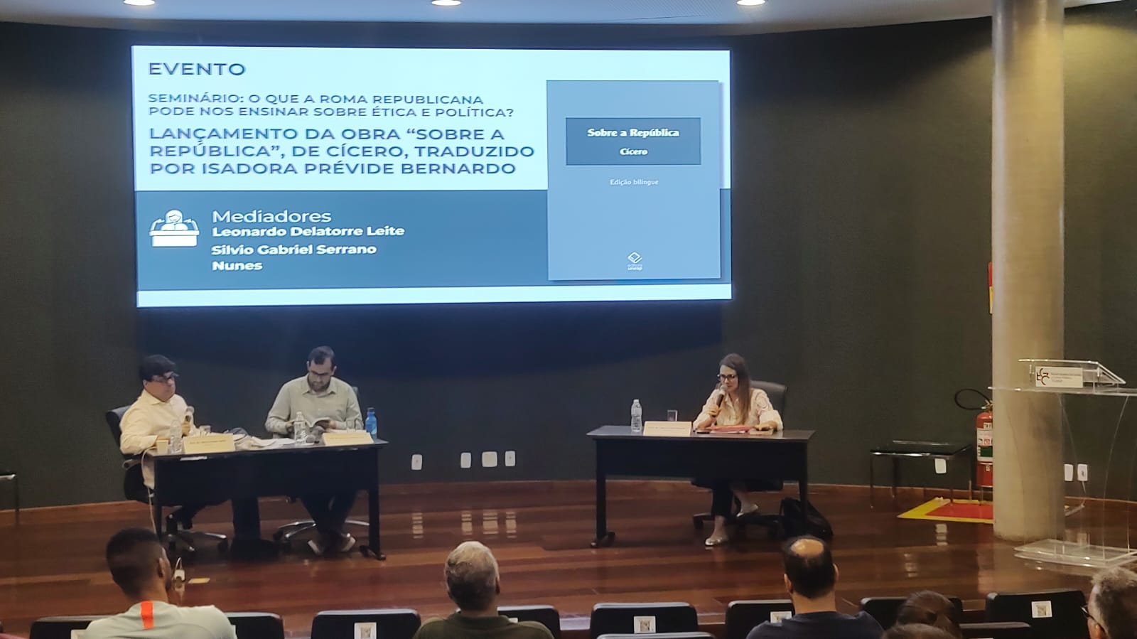 As atividades acadêmicas promovidas no sábado (22/03) envolveram inicialmente o seminário "O que a Roma Republicana pode nos ensinar sobre ética e política?". No período da manhã, essa formação trouxe à tona importantes lições da Roma Antiga, com enfoque especial para o lançamento da obra "Sobre a República", de Cícero, traduzido pela palestrante Isadora Prévide Bernardo e publicado pela Editora Unesp. O evento destacou como os princípios éticos e políticos da República Romana podem ser aplicados aos desafios contemporâneos, oferecendo uma perspectiva histórica para a compreensão das questões atuais.